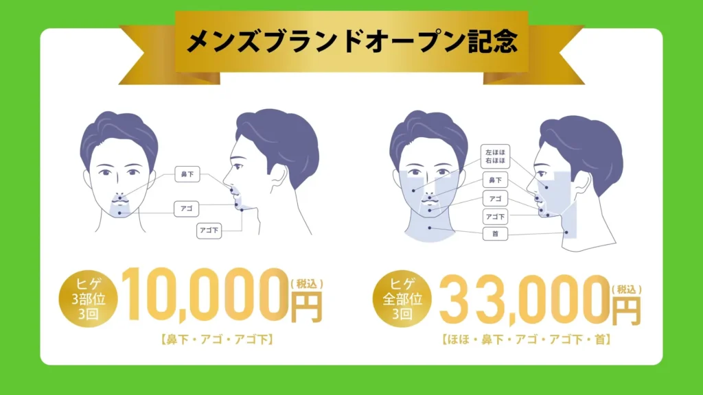| 脱毛料金 (3部位) 鼻下・アゴ・アゴ下 | 3回:10,000円 5回:44,250円 8回:64,000円 10回:73,750円 | 5回:13,800円 10回:27,600円 15回:41,400円 | 3回:9,900円 5回:39,800円 12回:82,560円 |