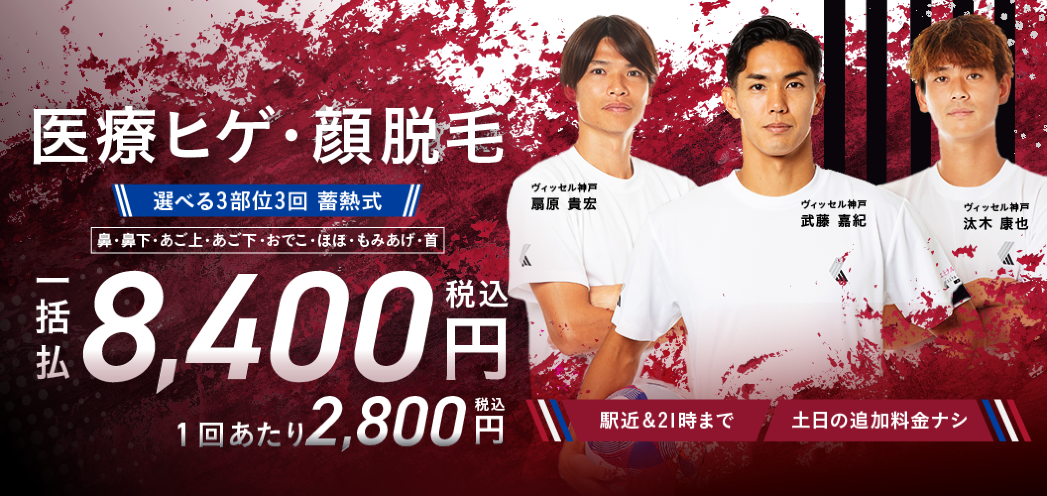 | 脱毛料金 (3部位) 鼻下・アゴ・アゴ下 | 1回:5,700円 3回:11,400円 6回:16,800円 | 5回:14,000円 | 3回:16,800円 6回:39,800円 12回:68,800円 18回:90,800円 | 3回:9,900円 5回:39,800円 12回:82,560円 | 3回:10,000円 5回:44,250円 8回:64,000円 10回:73,750円 | 3回:8,400円 5回:59,840円 | 5回:13,800円 10回:27,600円 15回:41,400円 | 5回:13,200円 | 1回:7,800円 | 1回:13,475円 5回:43,120円 10回:77,000円 |