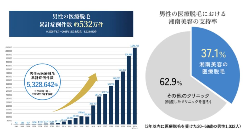 脱毛クリニックで1位を選ぶ基準にもよりますが、「コスト・効果・痛み対策」を総合的に考えるなら湘南美容クリニックが1位です。