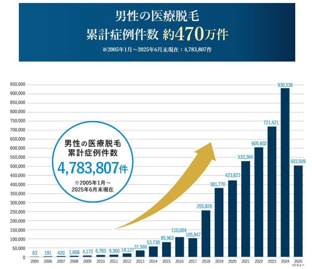 特に驚いたのは実績の多さです。男性の医療脱毛の推計症例件数は2025年6月末時点で470万件を超えています。
