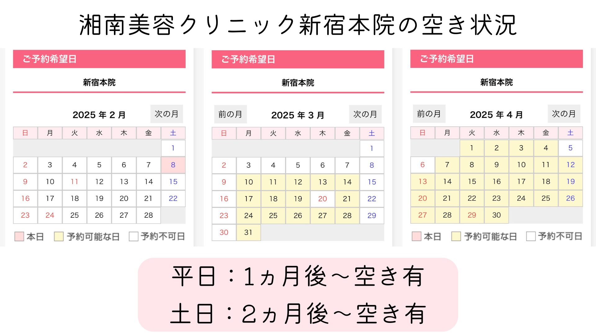 湘南美容クリニック最大の院である『新宿本院』の予約状況は以下の通りです。
