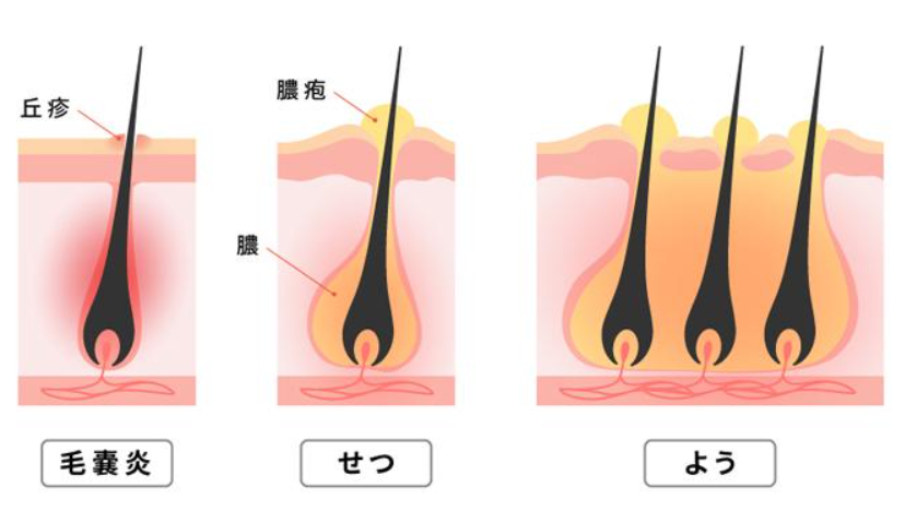 毛嚢炎が進行すると、感染や炎症が毛穴の奥深くまで広がり、『せつ』や『よう』と呼ばれる皮膚トラブルに発展することがあります。