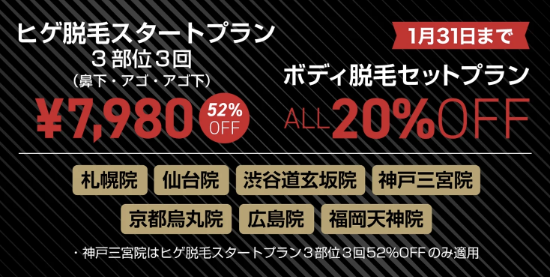 ヒゲ以外のムダ毛が気になる方には、ボディ脱毛が全コース20%OFFになるキャンペーンも用意されています。