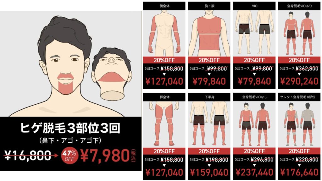 ヒゲ以外のムダ毛が気になる方には、ボディ脱毛が全コース20%OFFになるキャンペーンも用意されています。