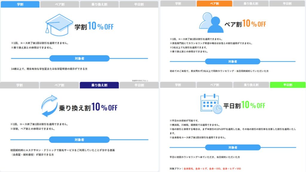 そのため、ヒゲ脱毛のみを検討している人は、学割・乗り換え割・ペア割の活用が中心になります。