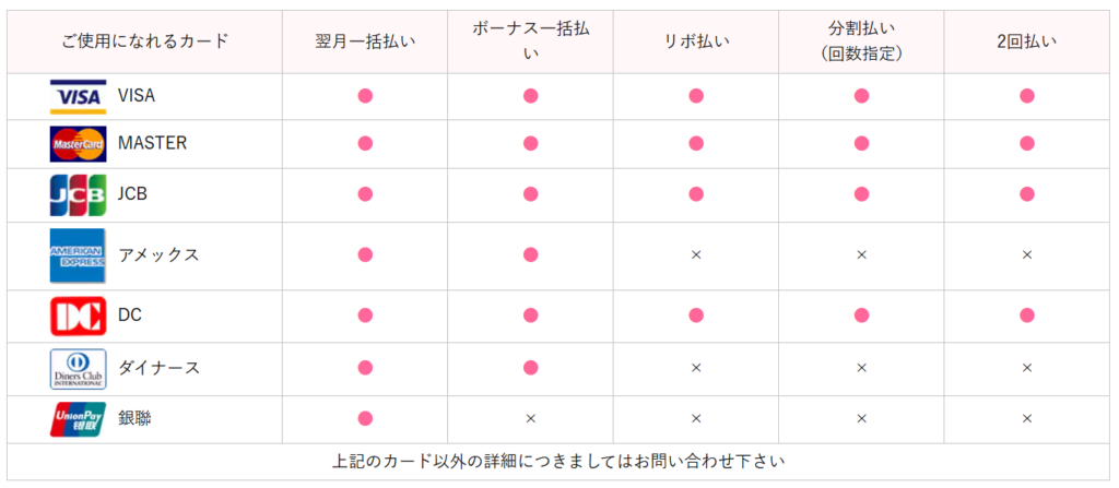 | カード会社 | 一括払い | 分割払い | リボ払い |