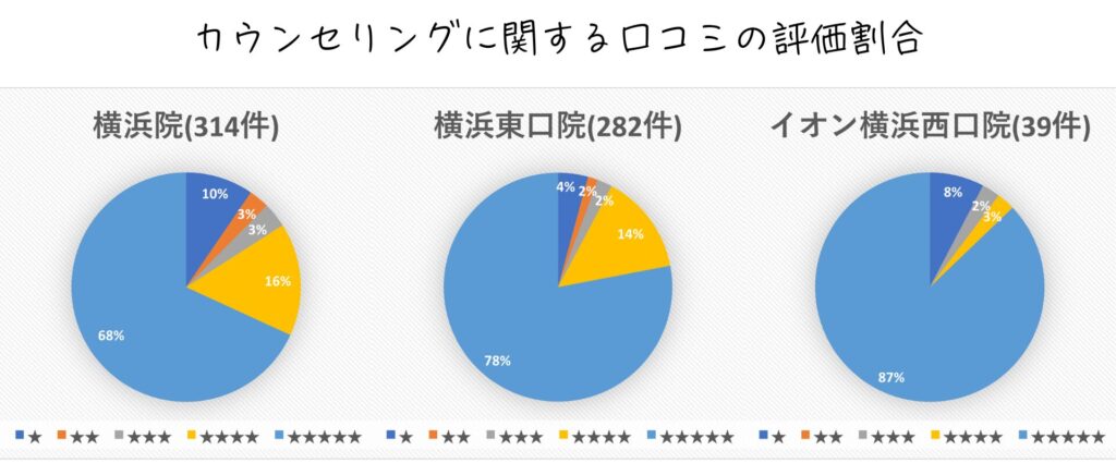 カウンセリングに関する口コミの件数は『横浜院』と『横浜東口院』が拮抗していますが、『横浜院』が314件で最も多かったです。