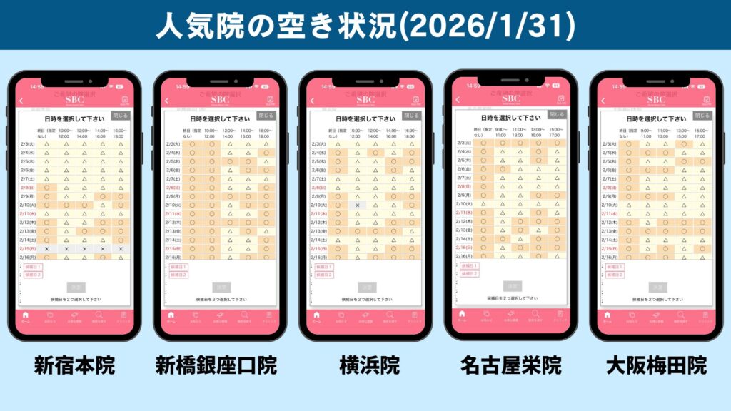 実際に、2026/1/31時点での人気院の予約状況を確認すると、最短3日後から予約可能な院も多く見られました。