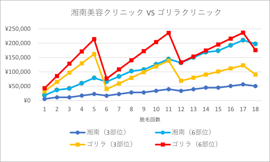 部位数・回数が増えると、ゴリラクリニックの方が安い