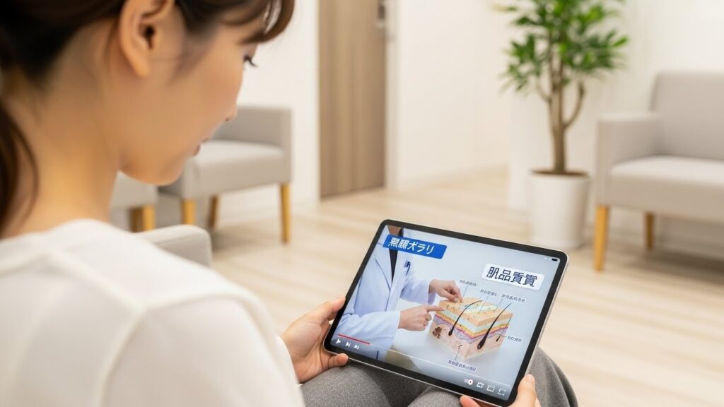 動画では、動画で具体的な施術の流れやレーザーの痛み、施術後の注意点など丁寧に解説されていたので、実際に施術を受ける前の不安がかなり和らぎました。