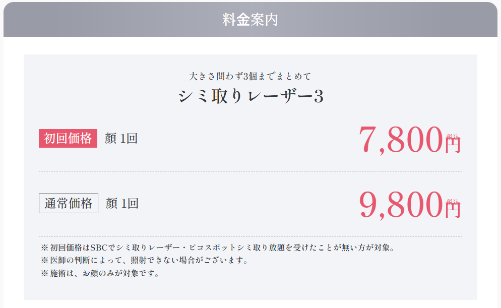 湘南美容クリニックのシミ取りは、1回の施術でも薄くなる可能性が高く、価格も7,800円~と非常にリーズナブル。正直、コスパ最強です。