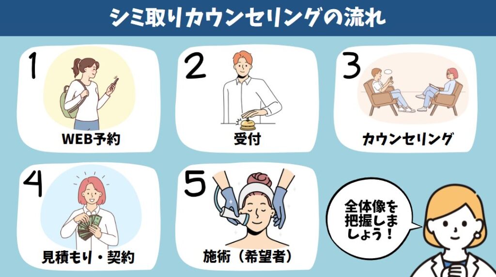 まずは、シミ取りカウンセリングの全体の流れをざっくり確認しましょう。