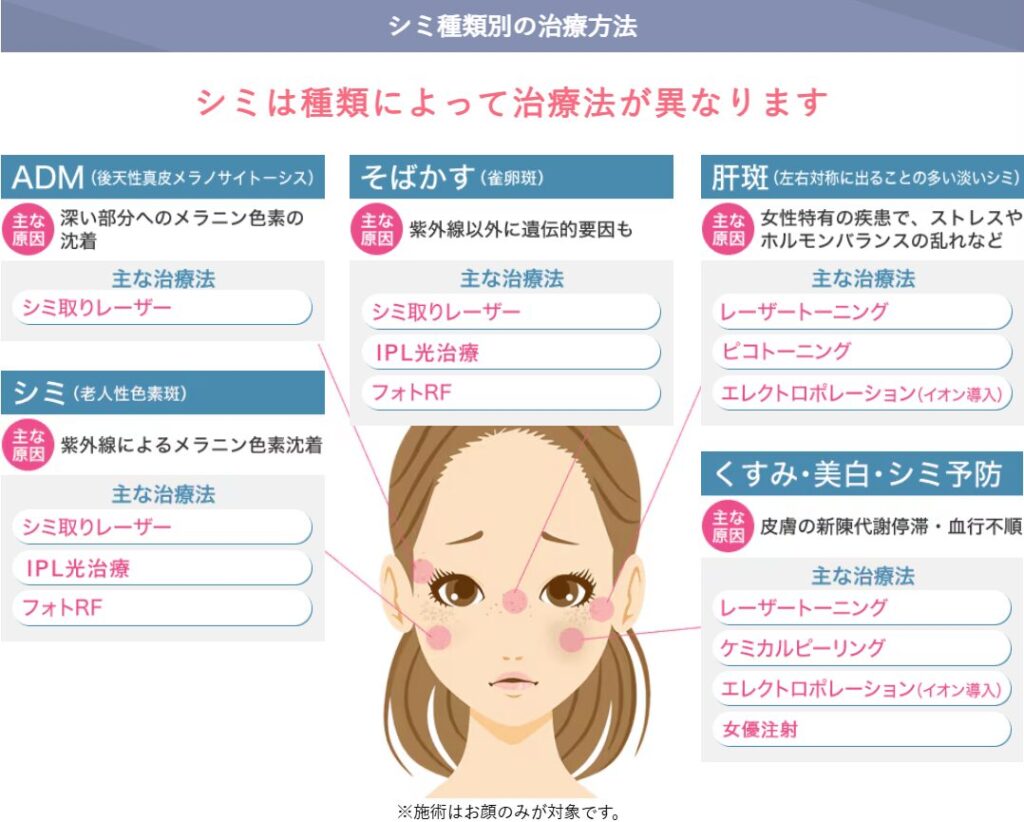 シミは一括りにされがちですが、実際にはシミの種類ごとに適した治療法が異なります。