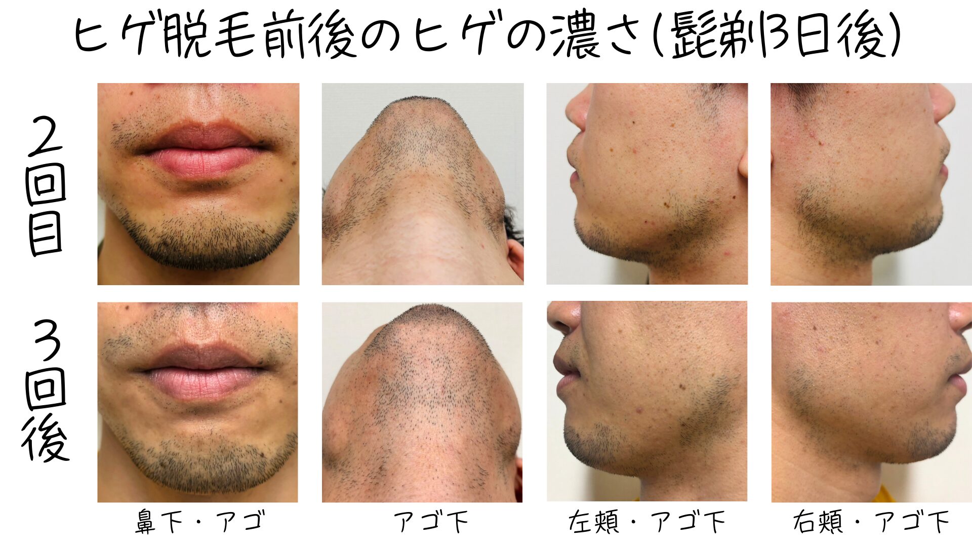 2,3回目の施術前後の画像を比較すると、意外にも顕著な違いは見られず、少しアゴ下のヒゲの密度が減った程度でした。