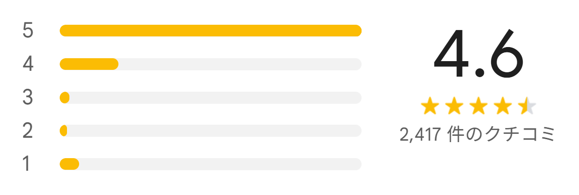 口コミ件数2417件に対して4.6点はかなり高評価です。星5を付けている人がかなり多いですね!